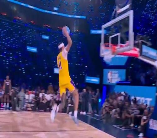 首輪布萊恩特率先登場,第一扣是360度大風(fēng)車,得到45.6分。理查德森隨后登場,自己將球拋出,跟上接球拉桿背扣,拿到45.4分。