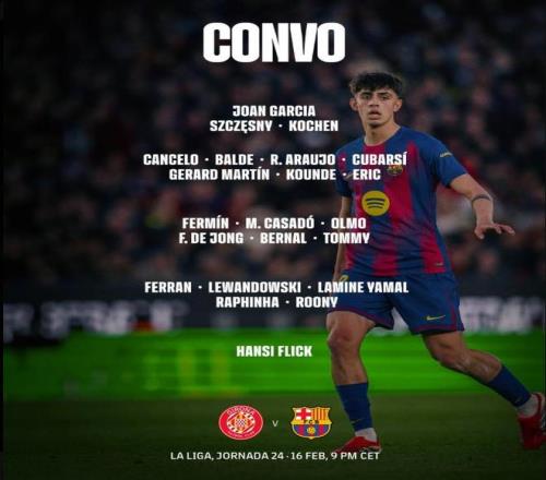 北京時間2月16日,巴塞羅那官方公布了明天凌晨4點客戰(zhàn)赫羅納的大名單,萊萬、亞馬爾領(lǐng)銜,拉菲尼亞回歸。