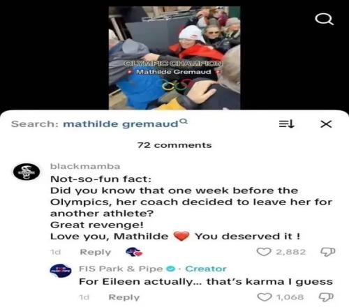 賽后,有網(wǎng)友在國(guó)際雪聯(lián)(FIS)官方社交媒體賬號(hào)評(píng)論區(qū)留言稱(chēng):"冷知識(shí):你知道嗎?在奧運(yùn)會(huì)前一周,她的教練決定離開(kāi)她,去執(zhí)教另一名運(yùn)動(dòng)員。這復(fù)仇太解氣了!愛(ài)你,馬蒂爾德,這是你應(yīng)得的!"