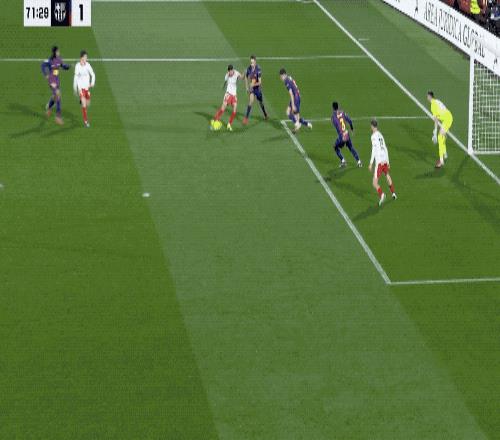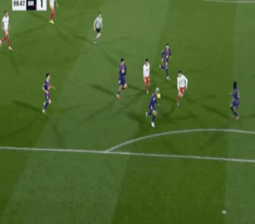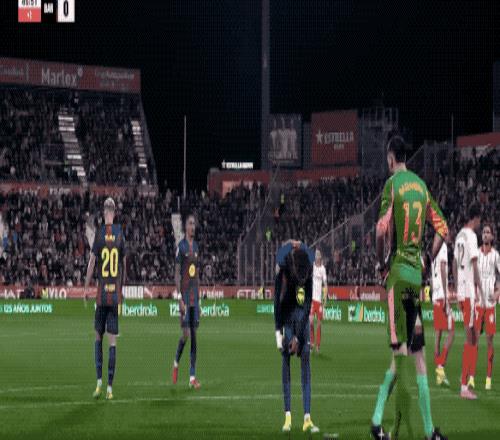 下半場開始后,巴薩繼續(xù)猛攻,第58分鐘,亞馬爾將球傳到后點(diǎn),拉菲尼亞的射門打在林孔的頭上出了底線,拉菲尼亞無奈苦笑。