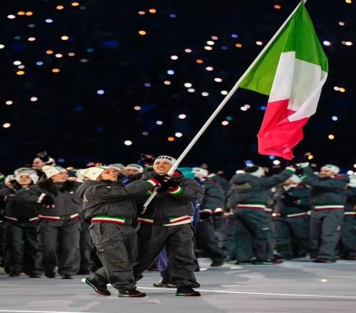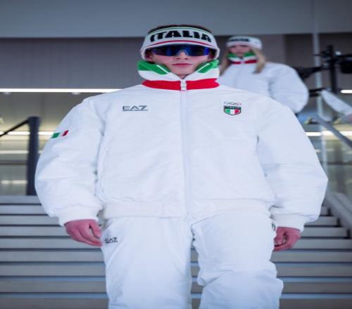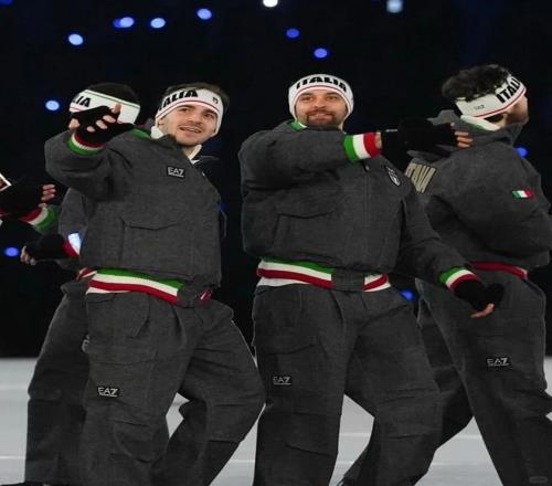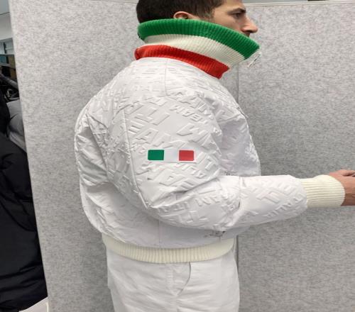 開幕式時(shí),意大利隊(duì)員穿的是一套灰色混紡羊毛工裝夾克。