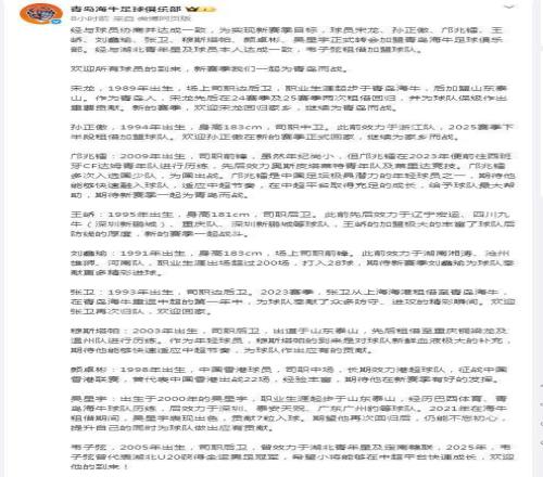 青島海牛大年初一官宣十將!北京時間2月17日上午,青島海牛俱樂部官宣,宋龍、孫正傲、鄺兆鐳、王嶠、劉鑫瑜、張衛(wèi)、穆斯塔帕、顏卓彬、吳星宇轉(zhuǎn)會加盟俱樂部,韋子弦租借加盟。
