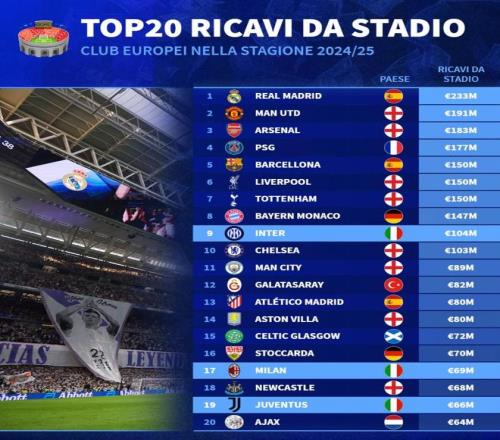 德轉統(tǒng)計2024-25賽季歐洲俱樂部球場門票收入TOP20:
