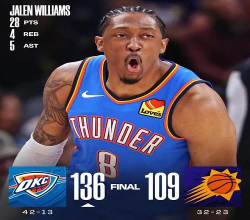 時間回到全明星之前,雷霆對陣太陽的比賽,這場亞歷山大、米切爾缺席,然后雷霆后場當(dāng)家球星杰威打出了非常出色的表現(xiàn):