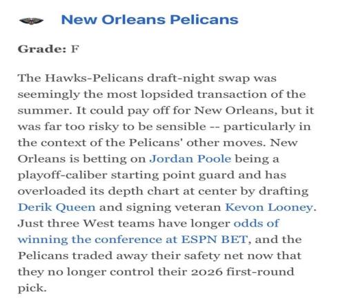 在當(dāng)時(shí),ESPN給出的休賽期操作評(píng)價(jià)里,鵜鶘是唯一一支得到F的球隊(duì),其中很大一部分原因就是因?yàn)檫@筆讓人“匪夷所思”的交易。