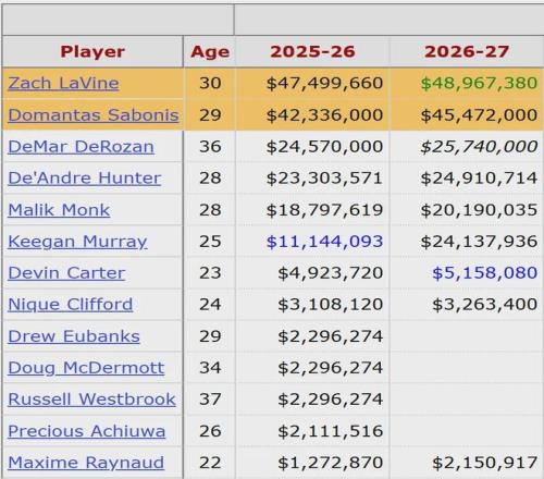 小薩博尼斯的合同是4年1.86億美元,2028年夏天才能到期。本賽季小薩因傷只打了19場比賽,其中15場首發(fā)。場均出戰(zhàn)29.7分鐘,得到15.8分11.4籃板4.1助攻0.9搶斷2.7失誤,三項命中率:54.3%,18.5%,72.7%。