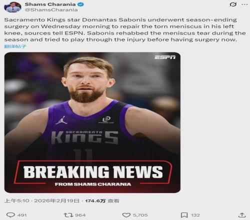 北京時間2月19日上午,NBA名記Shams報道,薩克拉門托國王隊內(nèi)線多曼塔斯-薩博尼斯接受左膝半月板撕裂修復(fù)手術(shù),本賽季報銷!小薩本賽季一直接受半月板撕裂的康復(fù)治療,并嘗試帶傷出戰(zhàn),但最終他還是選擇了手術(shù)。