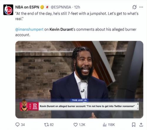 伊曼-香波特也談到‘KD疑似小號(hào)風(fēng)評’,他倡議大家回歸賽場本身,他說道:歸根結(jié)底,你們應(yīng)該回歸他的賽場表現(xiàn),他依然有著7尺的身高還能投籃,來讓我們看看真正的重要東西吧。