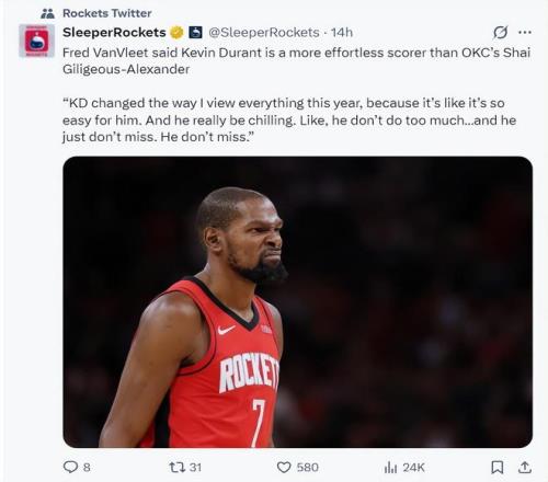范弗利特在播客節(jié)目也這樣評價(jià)杜蘭特:杜蘭特今年改變了我對得分的看法,因?yàn)閷τ谒麃碚f一切都太輕松了,他打得非常從容幾乎沒有過多的動(dòng)作,而且感覺他一出手就會(huì)進(jìn)球。