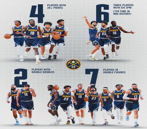 掘金兩個首發(fā)缺陣:阿隆-戈登和佩頓-沃特森都沒打。本賽季掘金場均120.9分,高居聯(lián)盟第一;進(jìn)攻效率123.8,同樣是聯(lián)盟第一;投籃命中率49.6%,聯(lián)盟第二;三分命中率39.6%,聯(lián)盟第一;場均罰球命中數(shù)21.1,聯(lián)盟第二。
