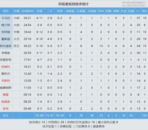 此役阿夫迪亞投籃10中5,三分4中0,罰球7中5,得到15分8籃板13助攻6失誤,正負(fù)值-30。約基奇打了29分鐘,投籃15中10,三分4中3,罰球11中9,狂砍32分9籃板7助攻4搶斷,正負(fù)值+40。其中正負(fù)值追平約老師生涯紀(jì)錄!