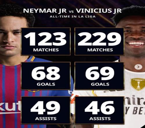 巴西天才西甲數(shù)據(jù)對(duì)比:內(nèi)馬爾123場(chǎng)68球49助,維尼修斯229場(chǎng)69球46助