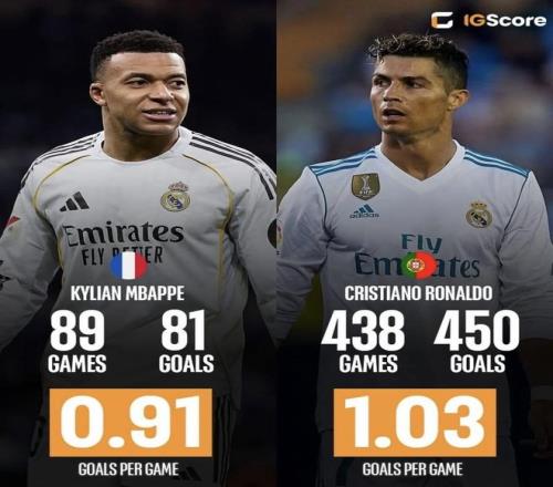 姆巴佩在皇馬前89場打進(jìn)81球,場均0.91,放在任何時(shí)代都算“開局就爆”。但對照C羅的皇馬數(shù)據(jù),真正讓人服氣的不是總進(jìn)球有多夸張,而是他把“超過一球一場”的效率,硬生生撐到了更長的比賽跨度:皇馬官網(wǎng)給出的俱樂部數(shù)據(jù)是438場451球。