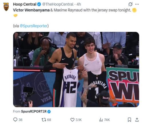 賽后文班亞馬與自己法國國青隊友雷諾互換了球衣。此役文班亞馬29分45秒,20中11,三分5中1,罰球7中5拿到28分15籃板6助攻1搶斷4蓋帽,命中率55%。雷諾則拿到16分12籃板1蓋帽。此役后文班亞馬生涯第545次蓋帽已經(jīng)升至馬刺隊史第五。