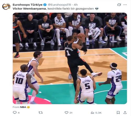 此役文班亞馬海在主場完成了一次持球突破的拉桿掄臂暴扣,裸足2.24米的文班亞馬還能完成如此炸裂的動作讓不少球迷覺得比全明星扣籃大賽還要有趣。