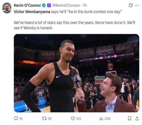 賽后文班亞馬談到自己的掄臂大風車,他表示自己未來有朝一日肯定會參與全明星扣籃大賽。