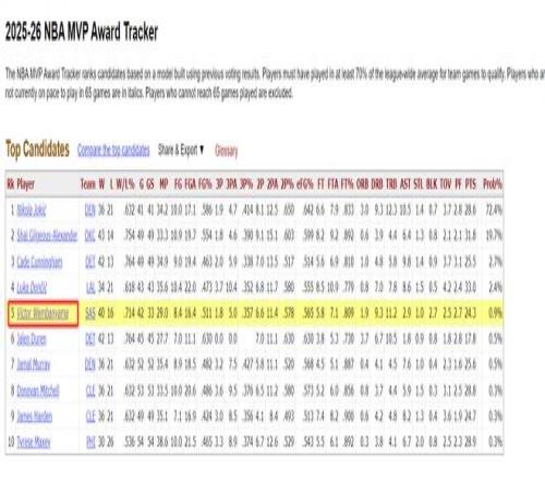 文班亞馬更強悍的地方在于,馬刺隊是西部第二的豪強,這讓文班亞馬的MVP概率排在聯(lián)盟第五,僅次于約基奇、亞歷山大、坎寧安、東契奇。從這個角度來看文班亞馬入選最佳一陣幾乎是板上釘釘,只要文班亞馬出戰(zhàn)超過65場應(yīng)該就是最佳陣容。