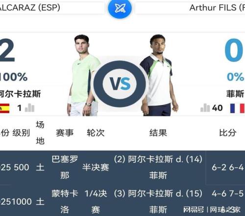 年輕的阿爾卡拉斯和菲斯,職業(yè)生涯在去年有過兩場交鋒。第一次發(fā)生在蒙特卡洛大師賽1/4決賽,阿爾卡拉斯以4:6的比分輸?shù)舻谝槐P,第二盤先后挽救了七個破發(fā)點(包括5:5之后的第11局0:40面臨三個連續(xù)的破發(fā)點),才以7:5的比分艱難扳回一盤,最后的決勝盤又在1:3落后的危境下連勝五局,逆轉淘汰了菲斯。第二次發(fā)生在背靠背的ATP500巴塞羅那站半決賽,阿爾卡拉斯兩盤輕松過關。