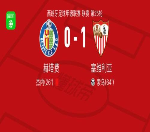 北京時(shí)間2月22日西班牙足球甲級(jí)聯(lián)賽 聯(lián)賽 第25輪,赫塔費(fèi)主場對(duì)陣塞維利亞。塞維利亞索烏破門。最終比分赫塔費(fèi) 0-1 塞維利亞。