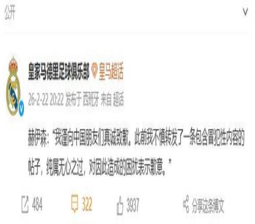 赫伊森轉(zhuǎn)發(fā)辱華言論道歉不真誠(chéng),皇馬官方未表態(tài),雙標(biāo)進(jìn)行到底